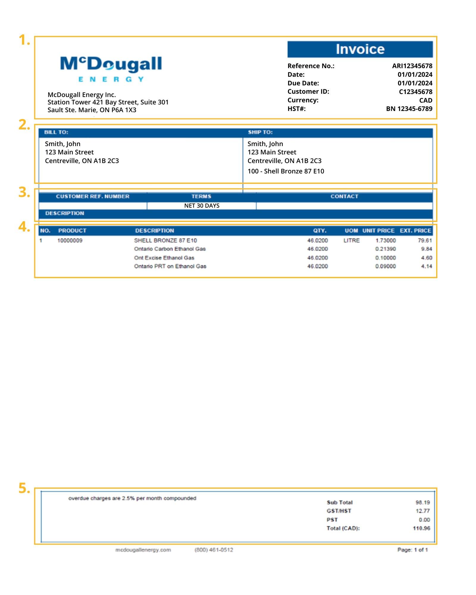 Understanding the key components of your invoice can help you manage your expenses and upcoming payments. Below, we have outlined the key components of a McDougall Energy invoice. Please note: some invoices may vary. For questions about your invoice, please contact your local McDougall Energy office. See all locations here.