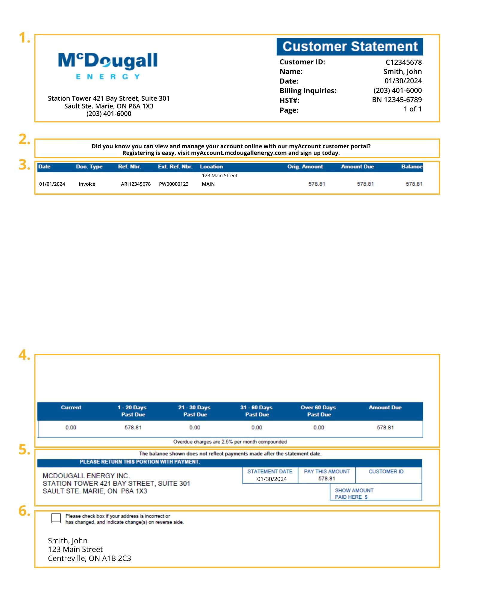 Understanding the key components of your statement can help you manage your outstanding payments and unpaid balances. Below, we have outlined the key components of a McDougall Energy Customer Statement. Please note: some statements may vary. For questions about your statement or how to make a payment, please contact the Credit Department at 1 (877) 849-2588.